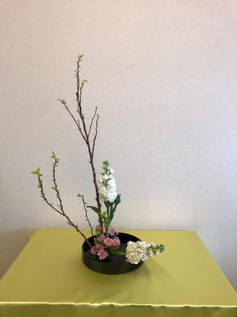 3月のお稽古花・自由花(エビデンドラム/ホワイトスター/ドラセナ)・基本花型(黄金葉/ストック/スプレーマム)
